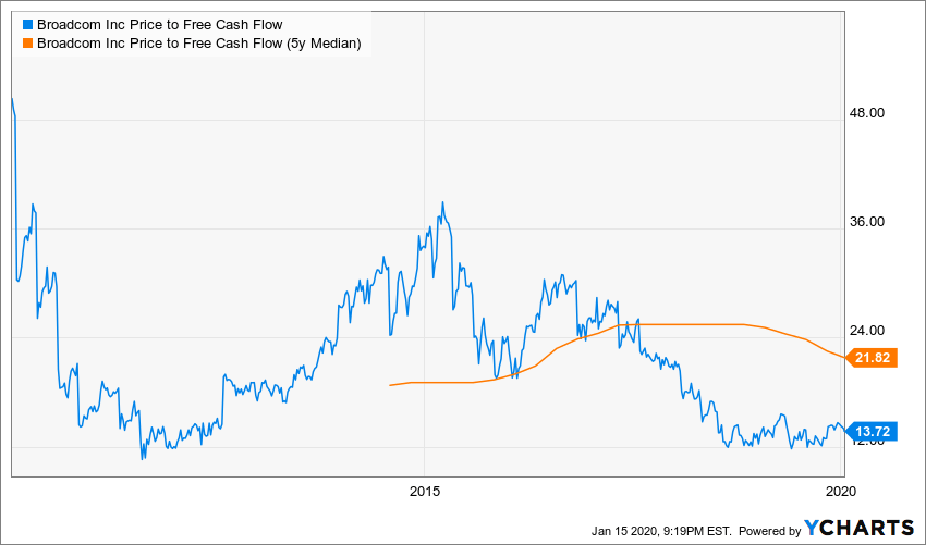 - Broadcom currently trades at a massive discount relative to its median 5yr price to free cash flow, granting investors an attractive entry point.