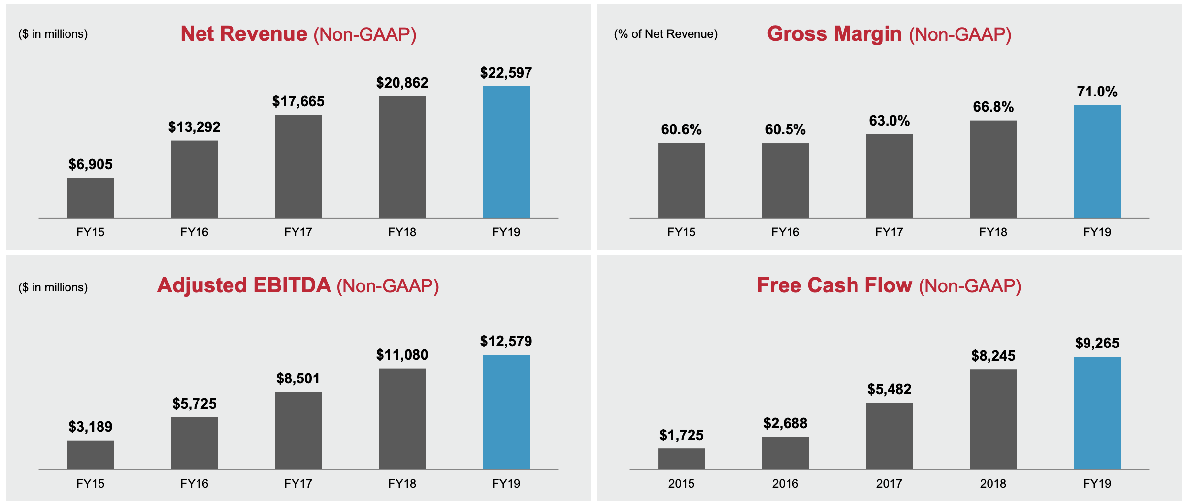- Despite the Huawei ban and China trade tensions, Broadcom’s financial performance for FY19 was actually quite stellar. In the chart below, every financial component improved from 2018 to 2019.