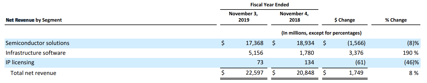 - The decline created their YoY revenue decline in their core Semiconductor Solutions business from 2018 to 2019: