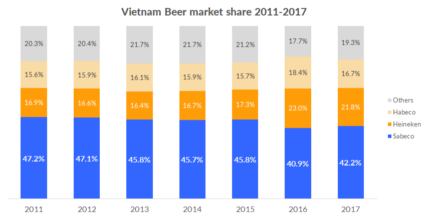 - At the end of 2017, Sabeco was still leading the market with a market share of 42.2%, 2 times that of Heineken (2nd-place) and 2.5 times that of Habeco (3rd-place). However, this was a sharp decrease from Sabeco’s share in 2011 (5%), which was gradually given to Heineken and Habeco.