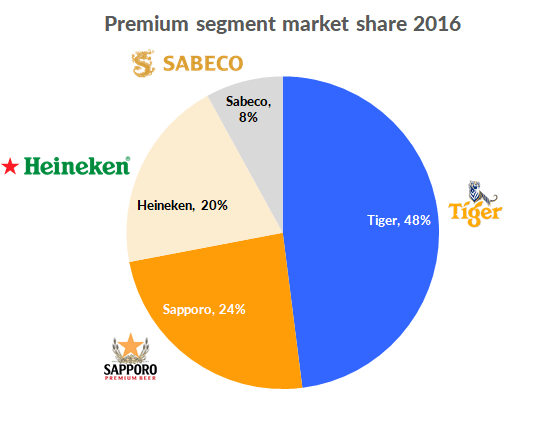 - Heineken NV was leading the premium segment with more than 68% market share for 2 brands: Heineken and Tiger. Notably, Heineken also dominates the premium market in Thailand with 95% market share in this segment. Therefore, this segment is not an advantage of Sabeco or even ThaiBev.